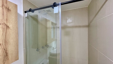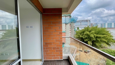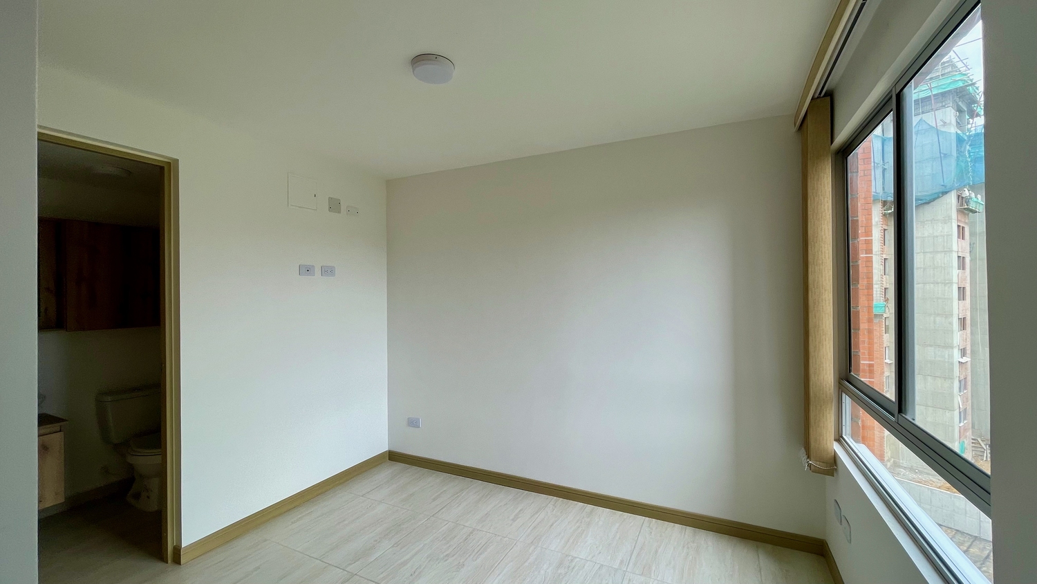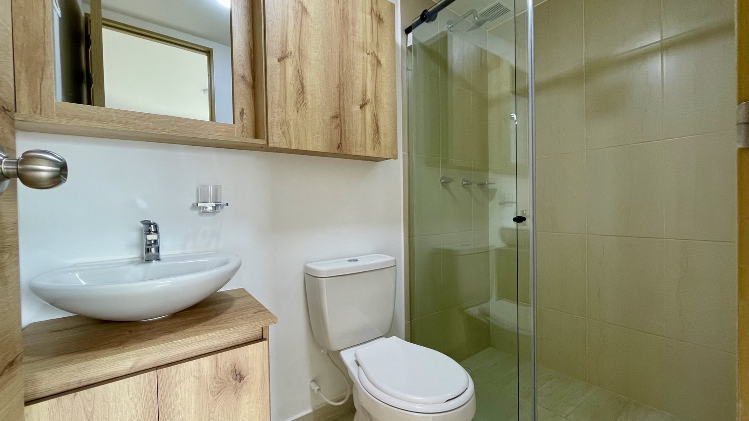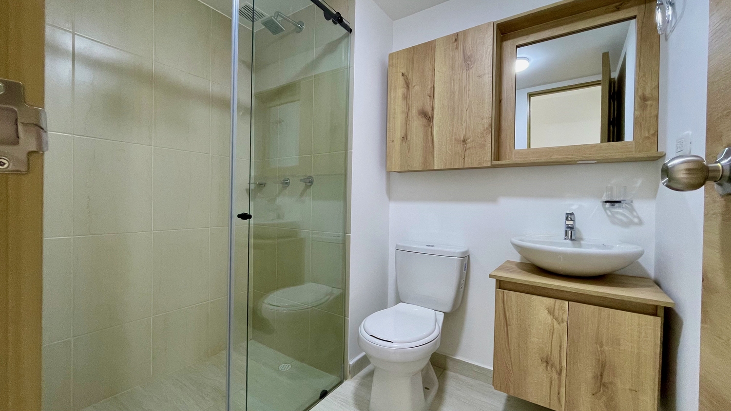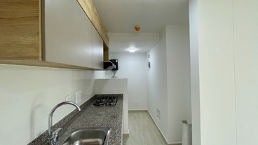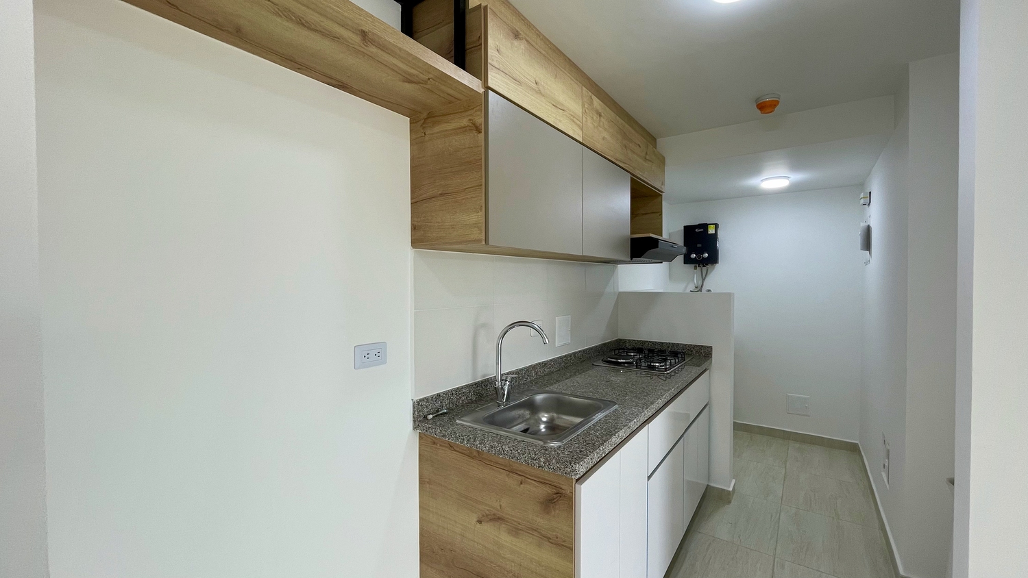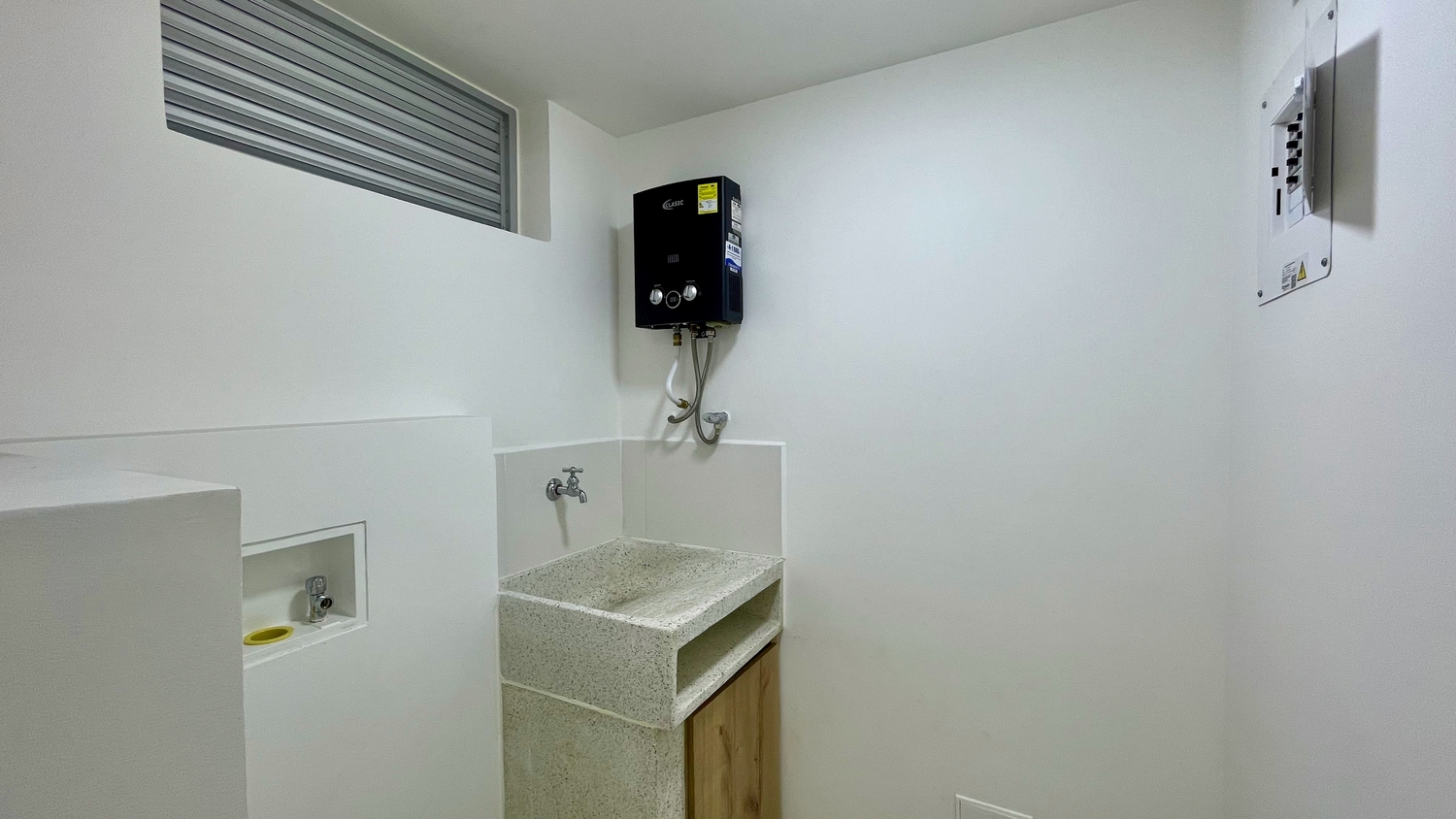 El apartamento cuenta con divisiones en vidrio templado, calentador a gas y persianas