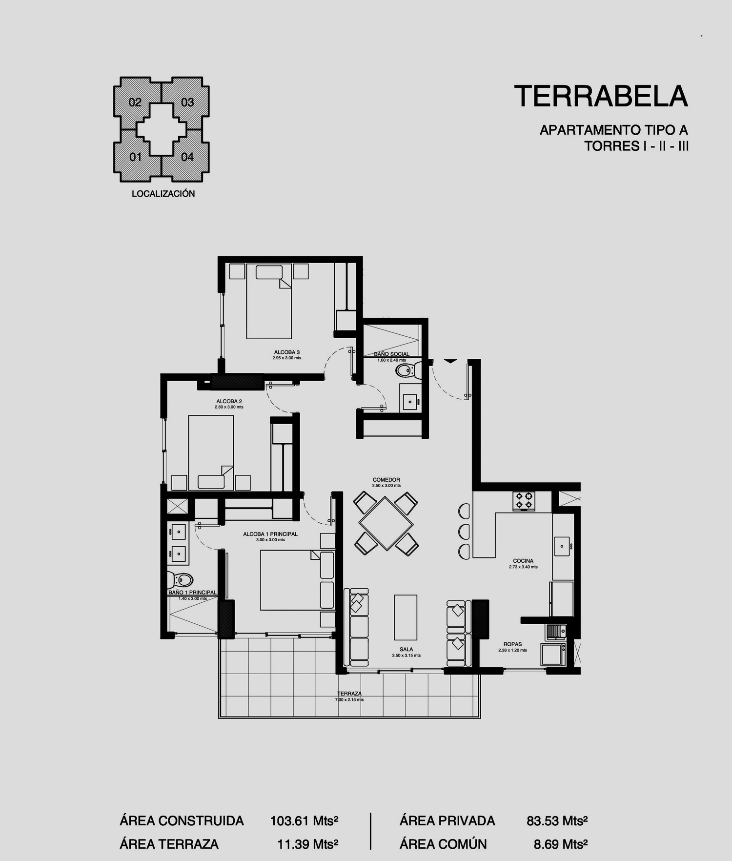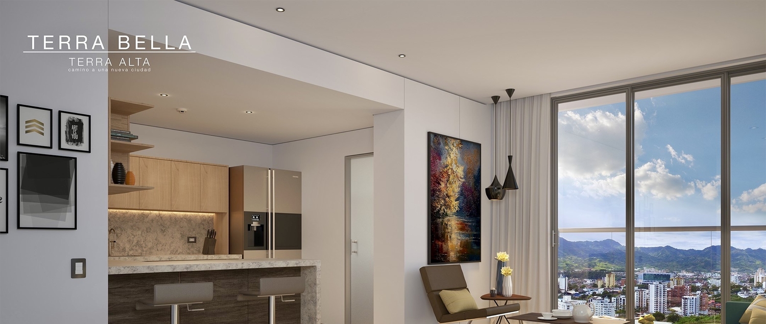 Sobre un terreno superior a 6.500 metros cuadrados, en Terra Alta, se construye Terra Bella. Tres torres de apartamentos con 16, 14 y 12 pisos que se desarrollan sobre una plataforma de estacionamientos cubiertos para residentes y visitantes. En su primer piso, la plataforma brinda a sus residentes diferentes amenidades con un pool club, gimnasio equipado, salones múltiples, zona de spa y relajación, zonas de BBQ, entre otras más. El diseño de los apartamentos busca maximizar el disfrute de luz natural, ventilación y visuales hacia la ciudad de Pereira y sus alrededores. Por esto, las unidades cuentan con altura libre entre piso y techo de 2.7 metros y zona social y habitaciones con terraza.