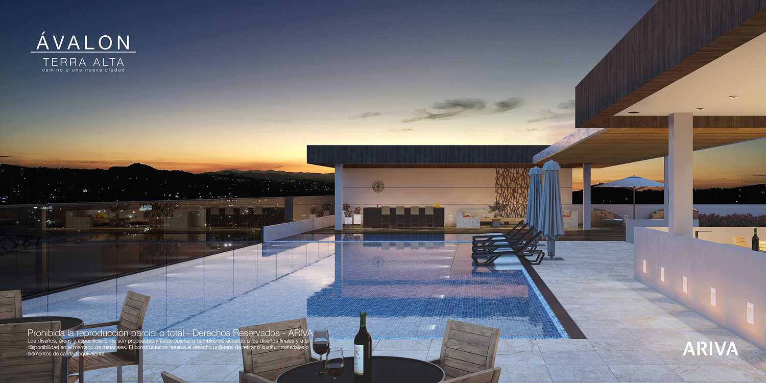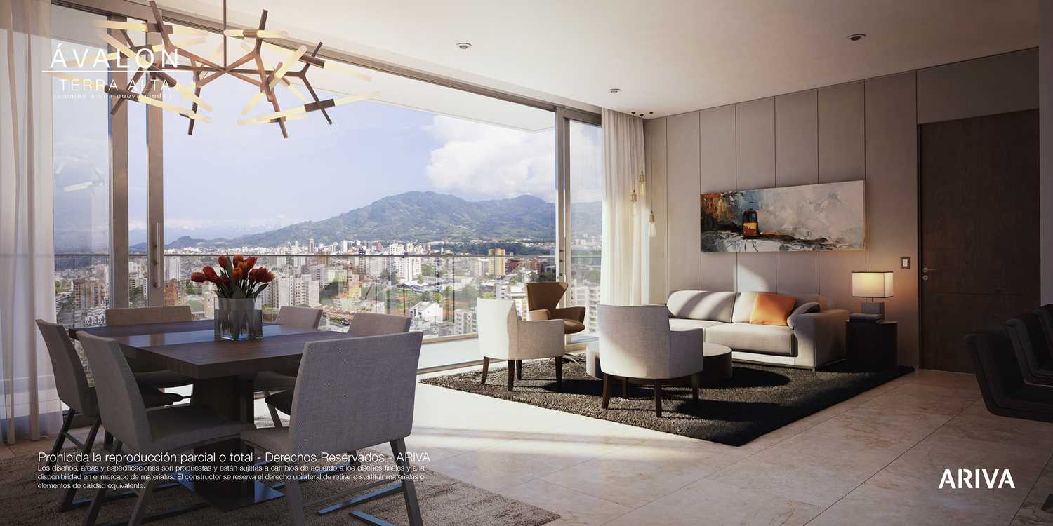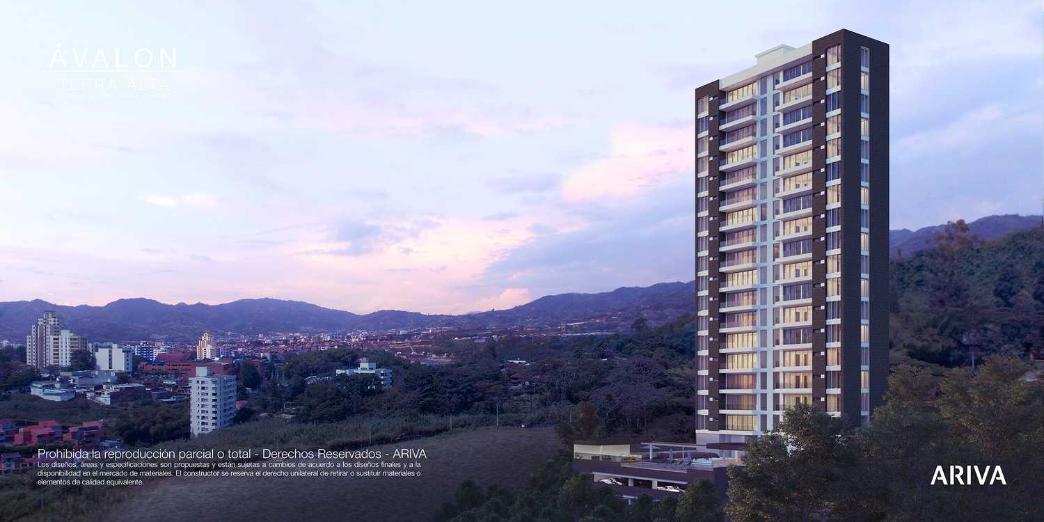 Sobre un terreno superior a 3.100 metros cuadrados, en Terra Alta, se construye Ávalon. Una torre de 20 pisos en la cual se ubican dos exclusivos apartamentos de 3 alcobas por piso. Los apartamenos cuentan con un área de 172.16 metros cuadrados construidos, altura libre entre piso y techo de 3 metros y ventanería piso techo. Dentro de ellos se distribuyen amplios espacios interiores: una zona social integrada, alcoba principal con vestier y baño, alcobas secundarias con baños independientes y una gran terraza donde disfrutará de vistas inigualables sobre Pereira. Cada apartamento incluye dos parqueaderos, un depósito y pre-instalación de redes para aires acondicionados (mini split).