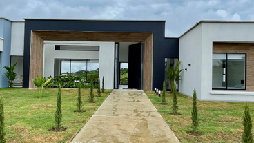 La fachada cuenta con elegantes tiras LED, brindando un toque moderno y sofisticado que realza el diseño arquitectónico de la casa.