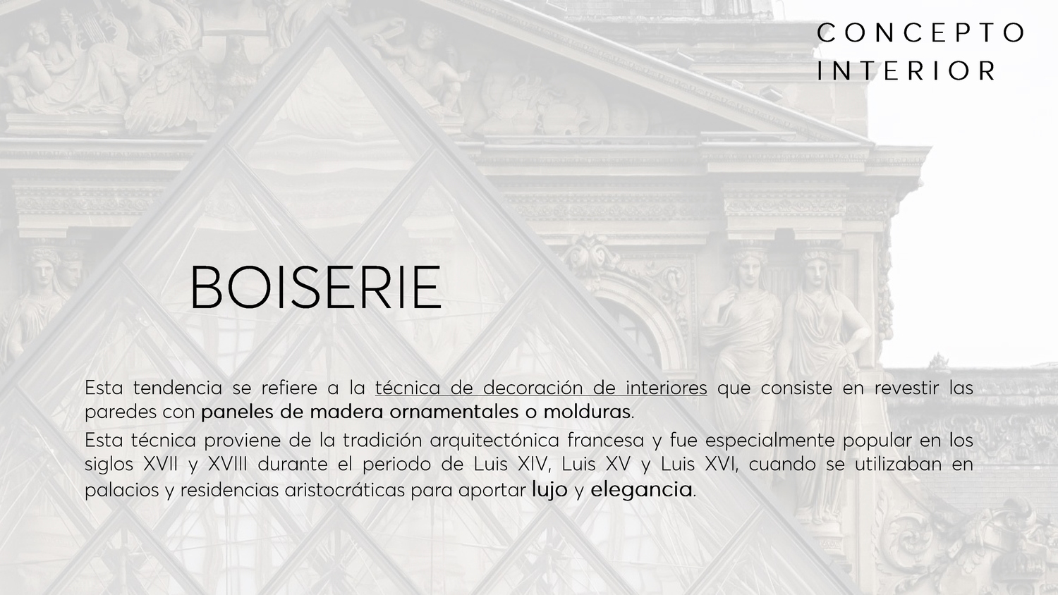 Esta tendencia se refiere a la técnica de decoración de interiores que consiste en revestir las paredes con paneles de madera ornamentales o molduras. Esta técnica proviene de la tradición arquitectónica francesa y fue especialmente popular en los siglos XVII y XVIII durante el periodo de Luis XIV, Luis XV y Luis XVI, cuando se utilizaban en palacios y residencias aristocráticas para aportar lujo y elegancia.