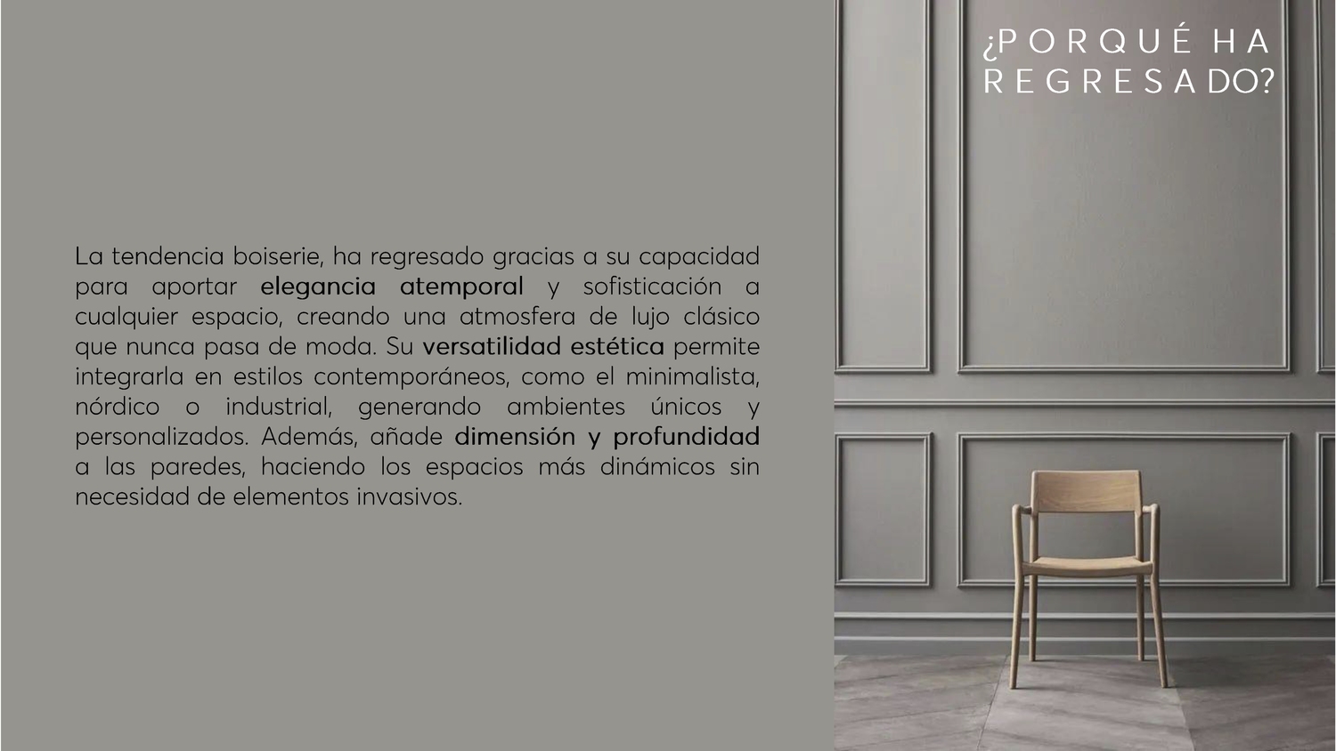 La tendencia boiserie, ha regresado gracias a su capacidad para aportar elegancia atemporal y sofisticación a cualquier espacio, creando una atmosfera de lujo clásico que nunca pasa de moda. Su versatilidad estética permite integrarla en estilos contemporáneos, como el minimalista, nórdico o industrial, generando ambientes únicos y personalizados. Además, añade dimensión profundidad a las paredes, haciendo los espacios más dinámicos sin necesidad de elementos invasivos.