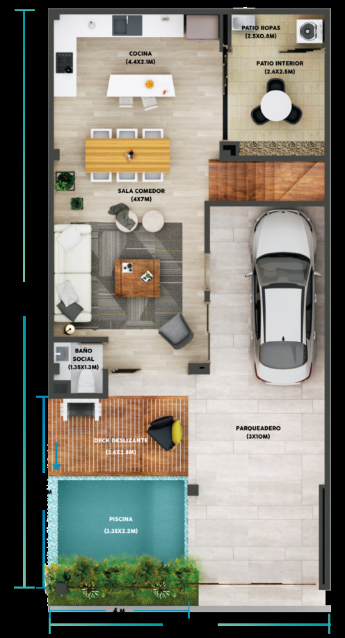 La zona social estará conformada por salón social, cancha múltiple, gimnasio (Fitness center), parque de juegos actuáticos infantiles, senderos peatonales, zona Co-Working, lounge bar, salón de juegos, zona de mascotas, paneles solares en zonas comunes y planta eléctrica para todo el conjunto