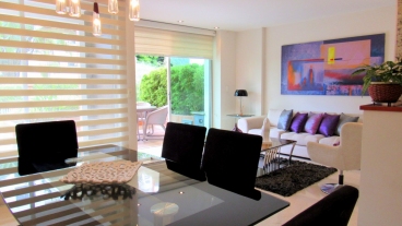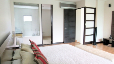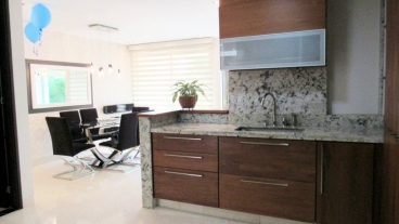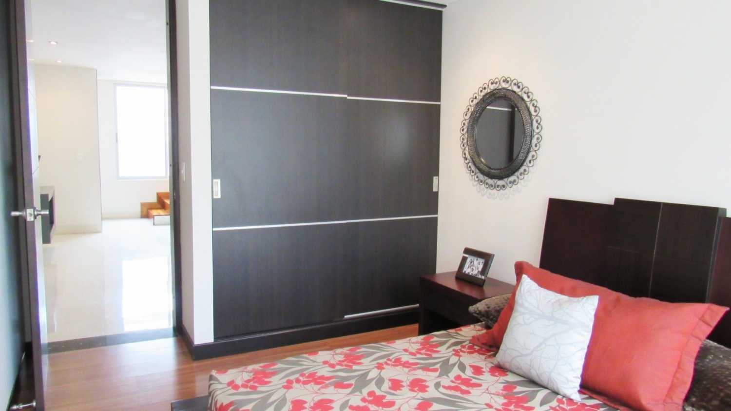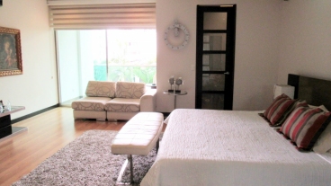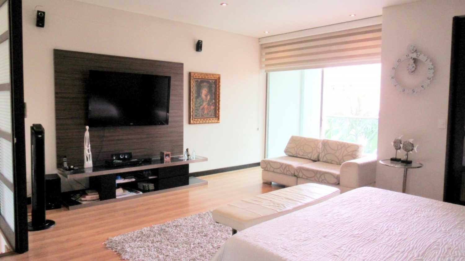 Habitación principal con vestier, baño con doble lavamanos, sala y terraza cubierta
